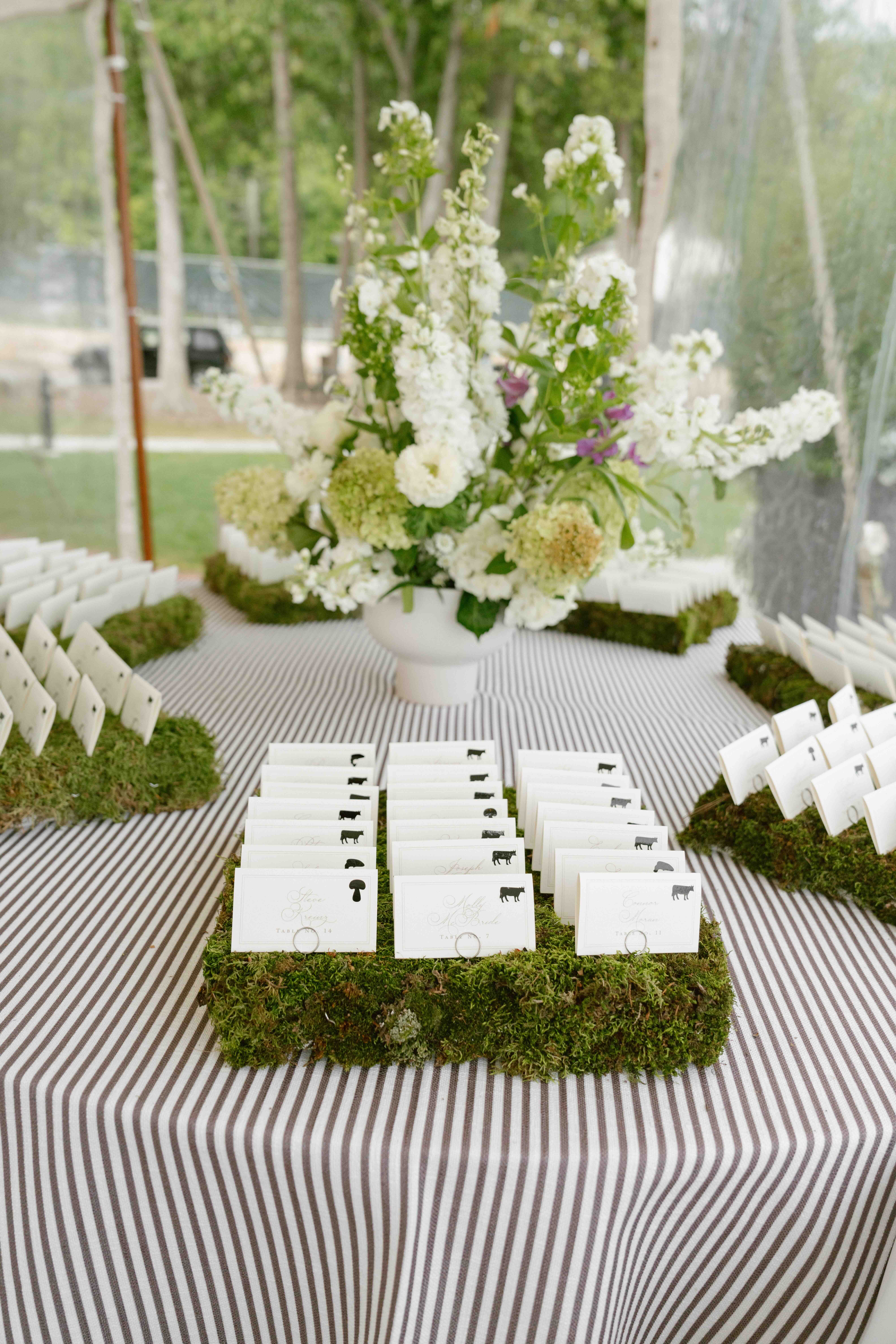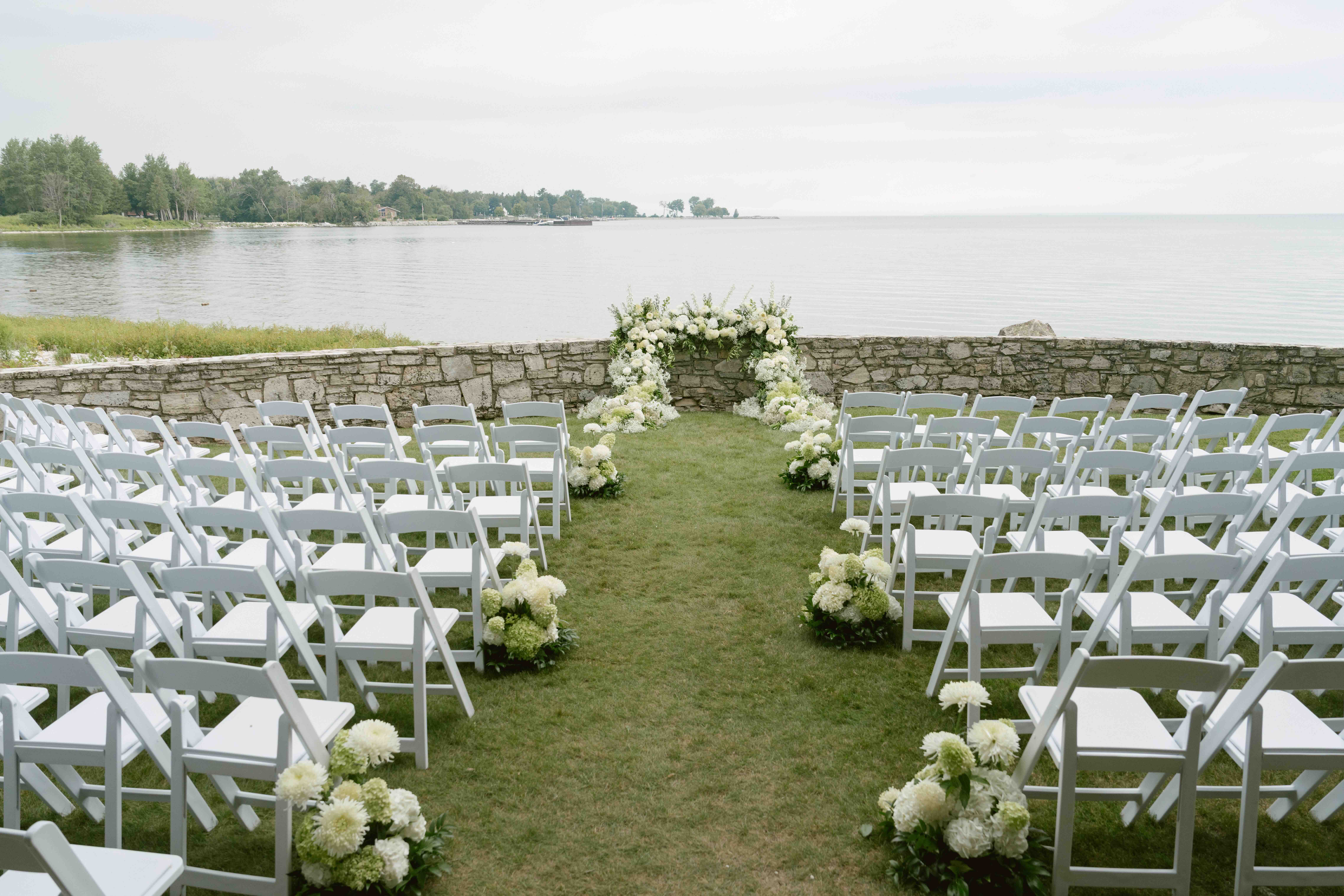 The design vision was crisp, clean, and timeless, inspired by Door County’s natural landscape. A moss-covered seating chart set the tone, while a wooden head table and a stone ceremony wall were both adorned with cascading hydrangeas, grounding the aesthetic in organic elegance.