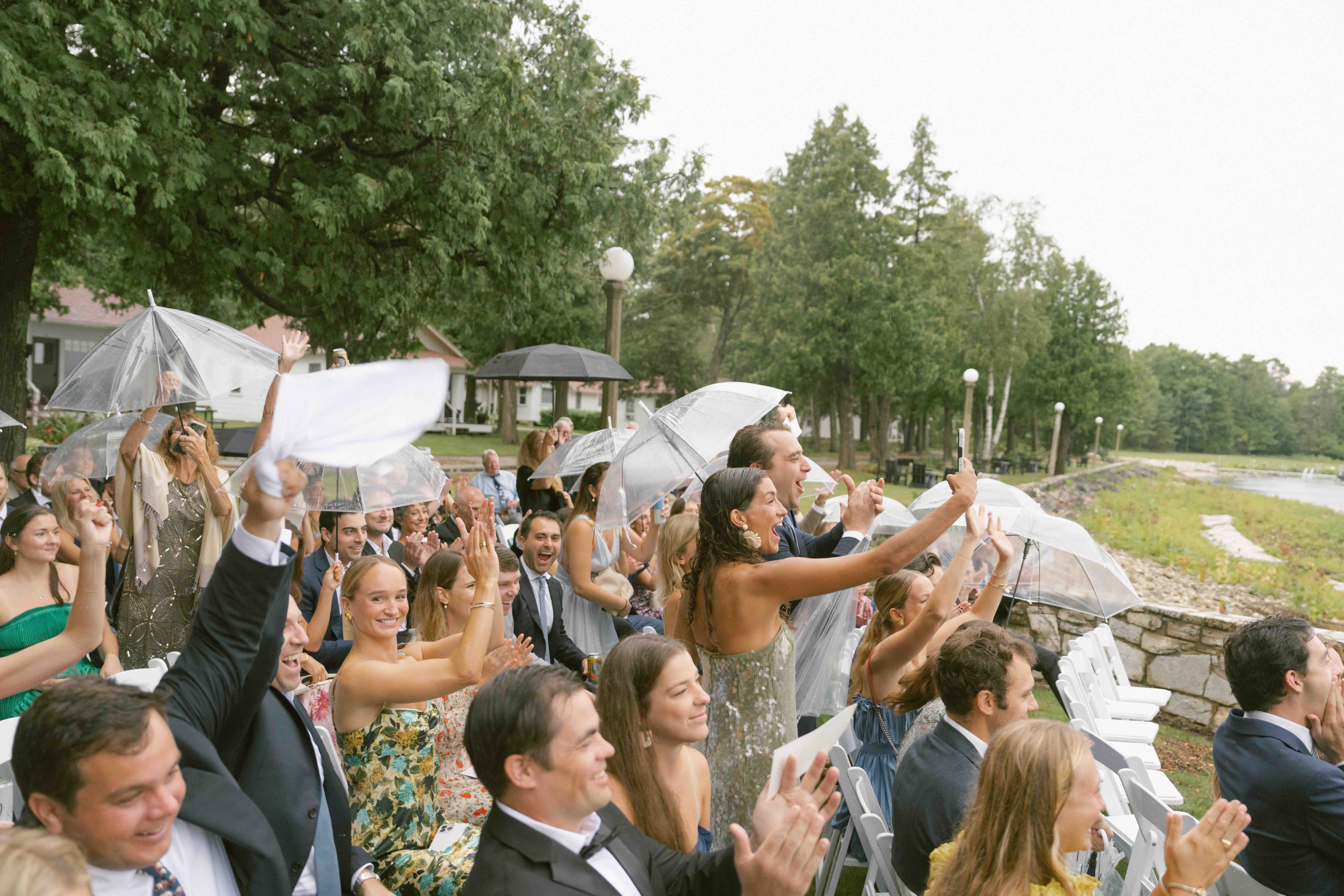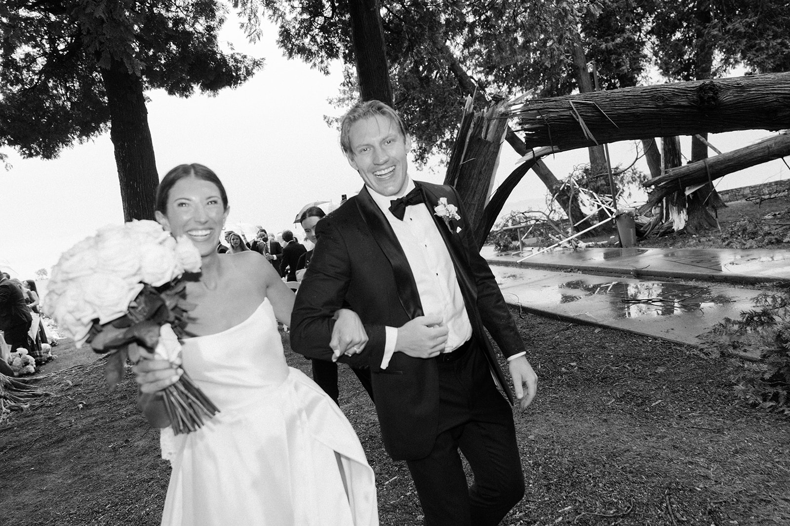 As we monitored the radar, we made the call to delay the ceremony slightly, anticipating a brief downpour. Instead, the weather took a dramatic turn. High winds tore through the venue blowing ceremony chairs into the lake and trees falling across the venue. The power went out and even the reception tent collapsed.